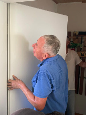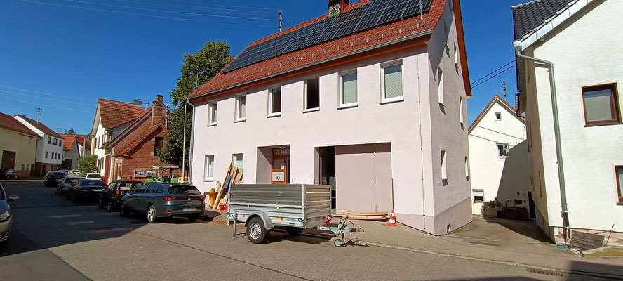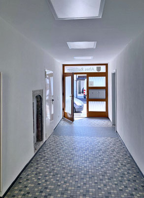 Eine Woche danach, am Samstag, 16. August, wurde der Eingangsbereich fertig gestrichen. Und anschließend der Feinputz als letzter Arbeitsgang angebracht. Der Flur strahlt in neuem Glanz.